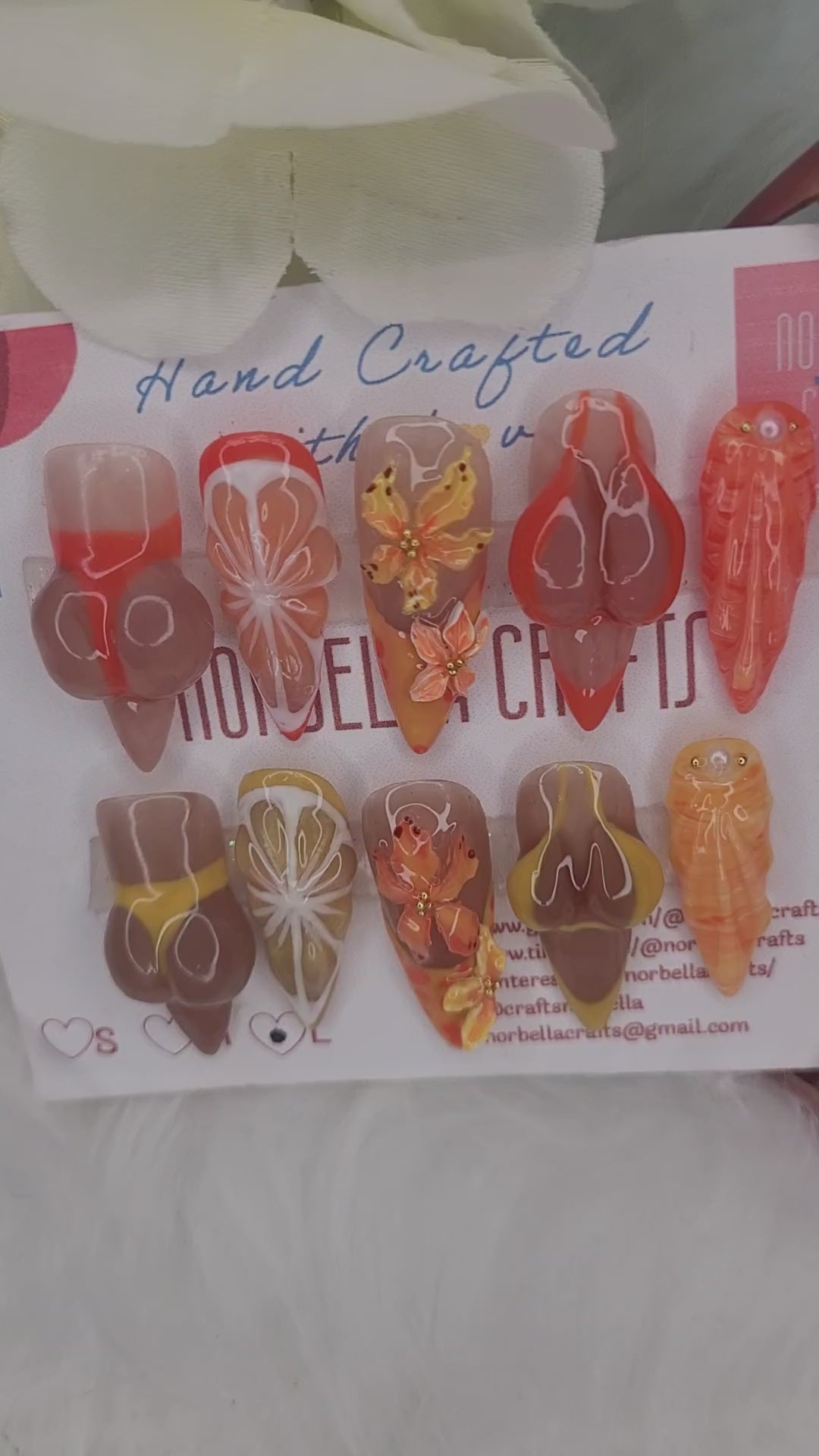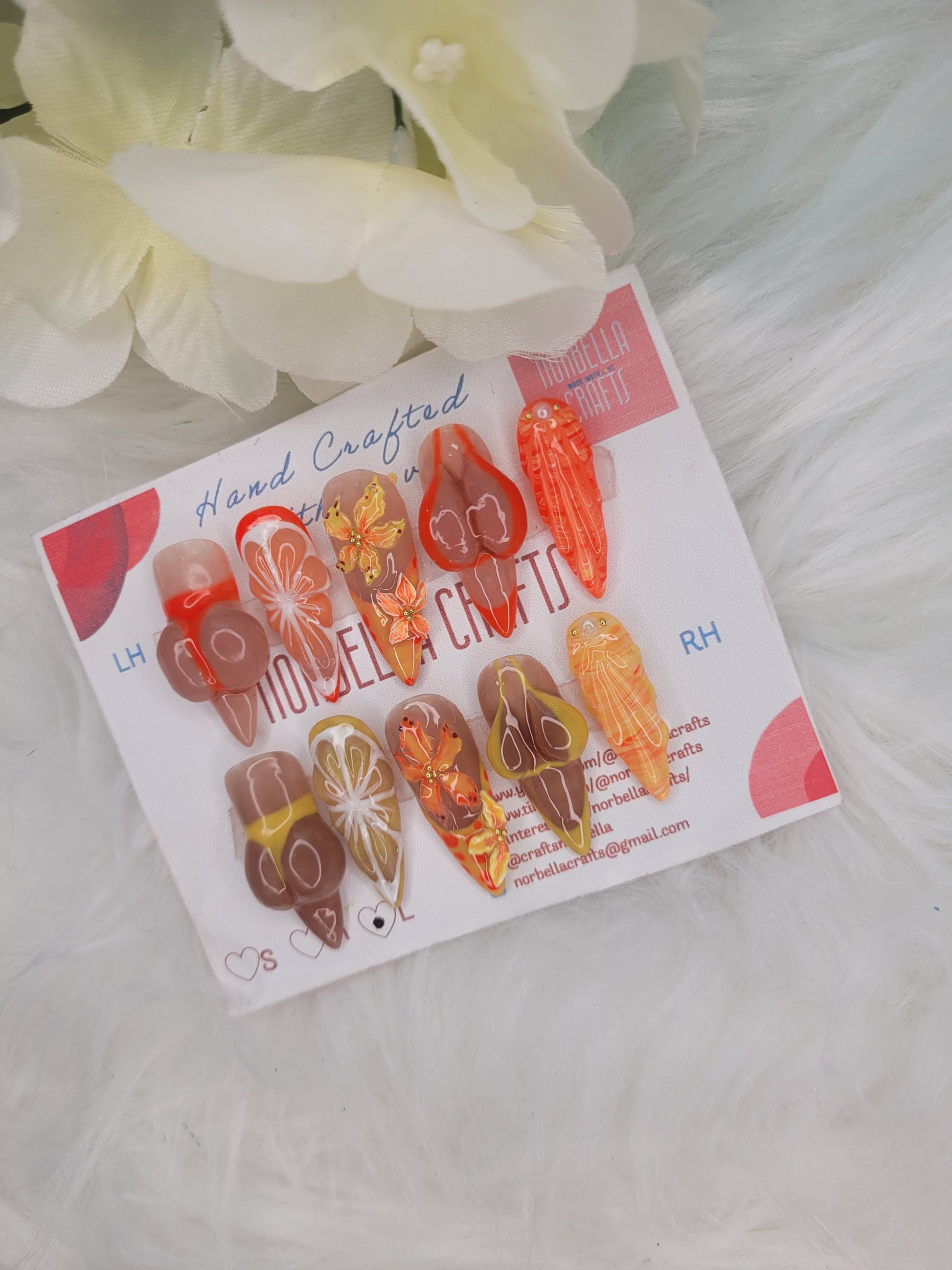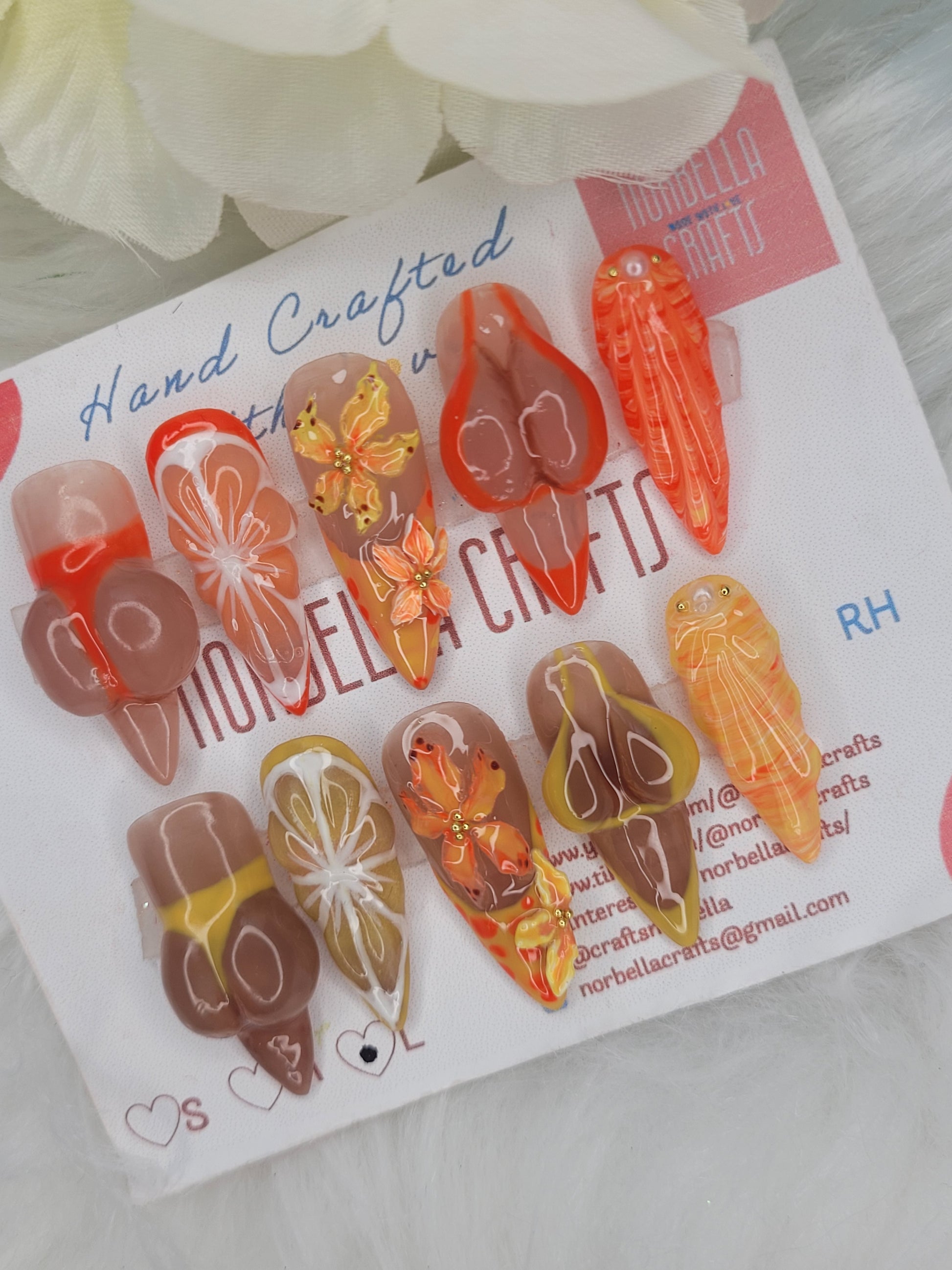 Bring island vibes to your fingertips with our handcrafted Bikini Bloom Press-On Nails. This bold and vibrant set features a radiant mix of sunset oranges, earthy browns, tropical yellows, and intricate 3D floral accents. Each nail is individually hand-painted with care, showcasing unique designs—from delicate petals to vibrant marbling—perfect for turning heads at any summer event, vacation, or festival.
