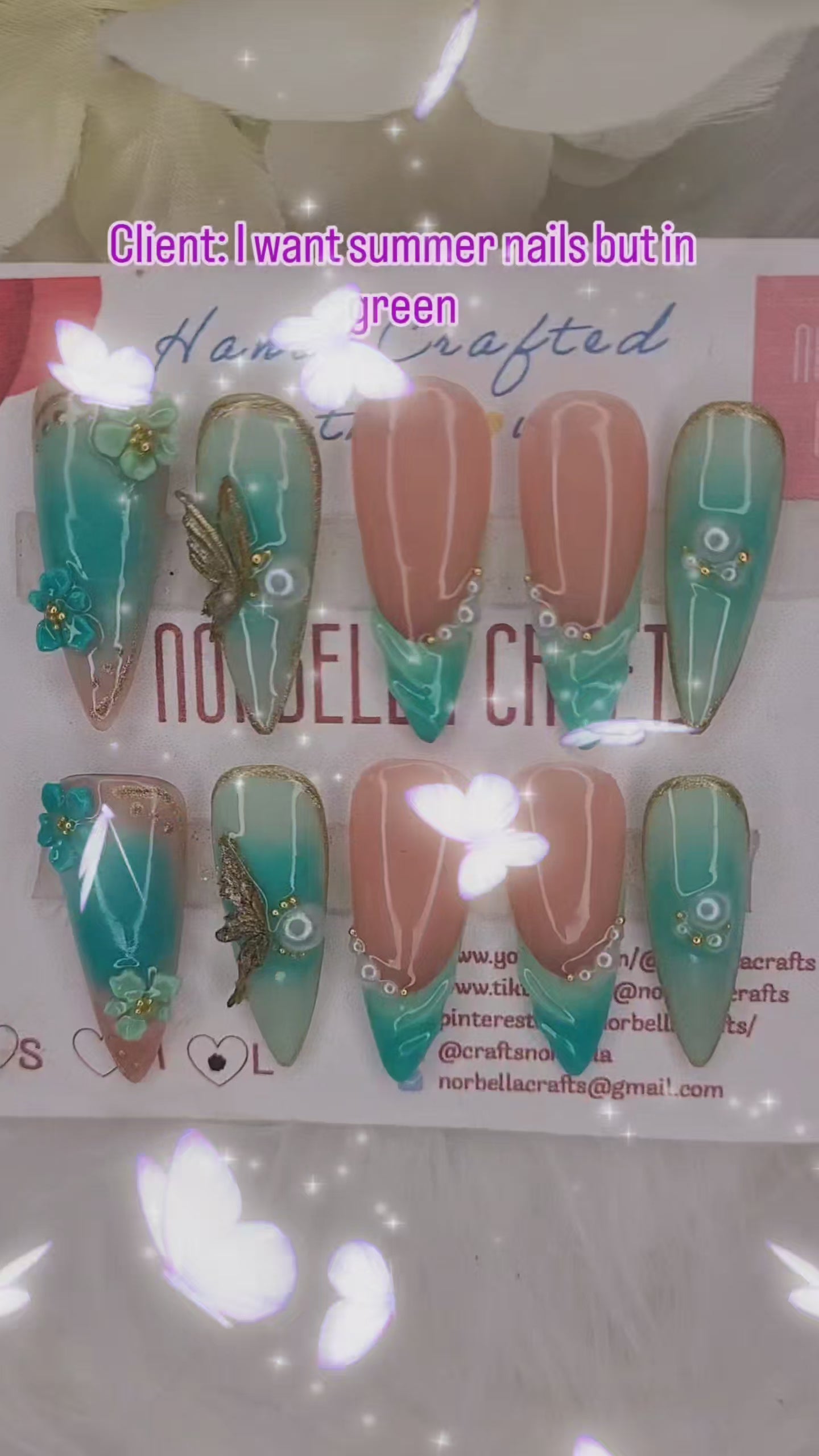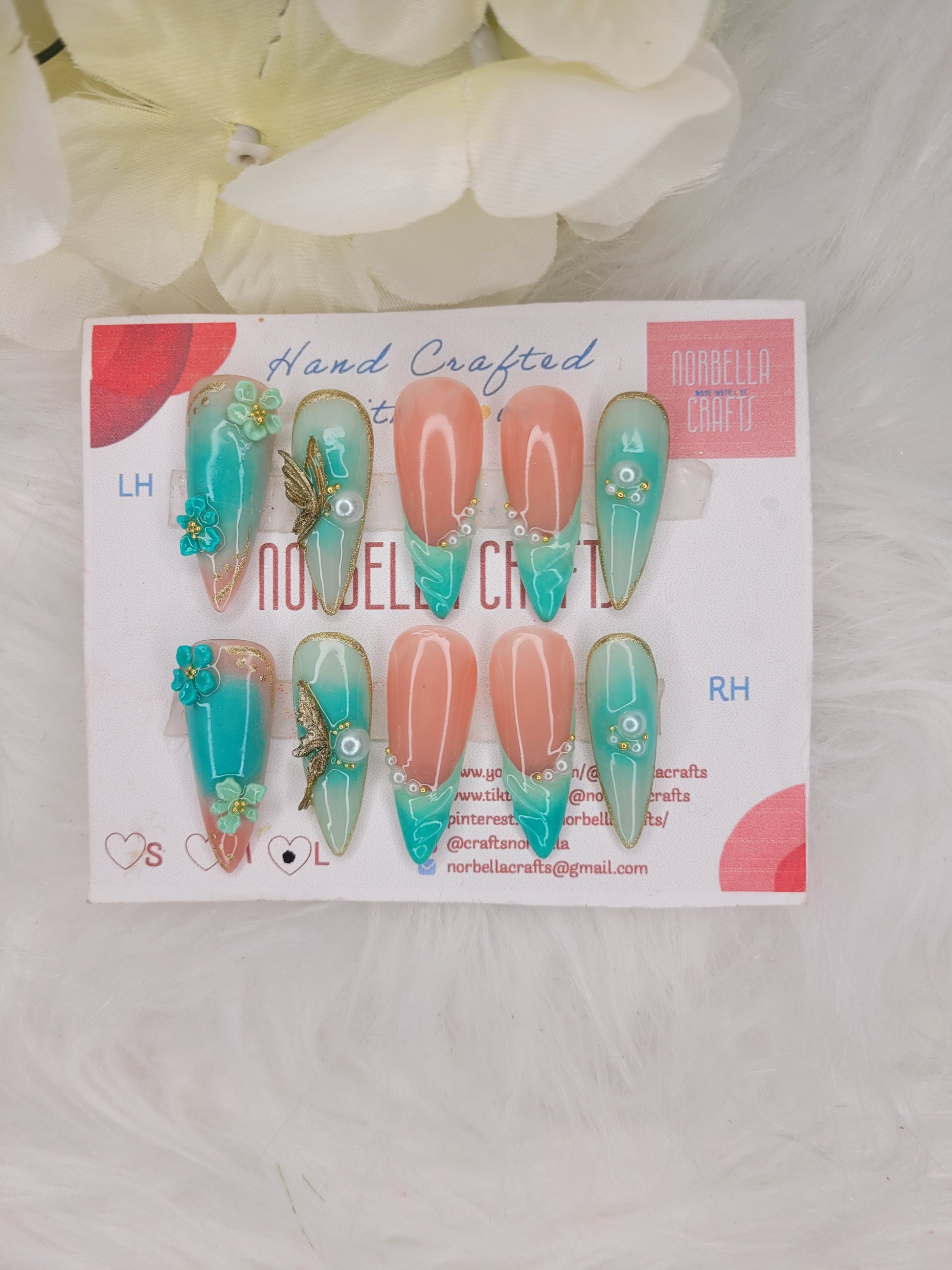 Dive into elegance with our Green Summer Press-On Nails – a serene fusion of seafoam green, soft peach, and dreamy aqua with gold accents. This set features delicate hand-crafted florals, shimmering pearls, and gold butterfly charms that bring a whimsical, ocean-inspired charm to your fingertips. Designed to make a splash, these nails are perfect for beach weddings, vacations, or everyday goddess vibes.