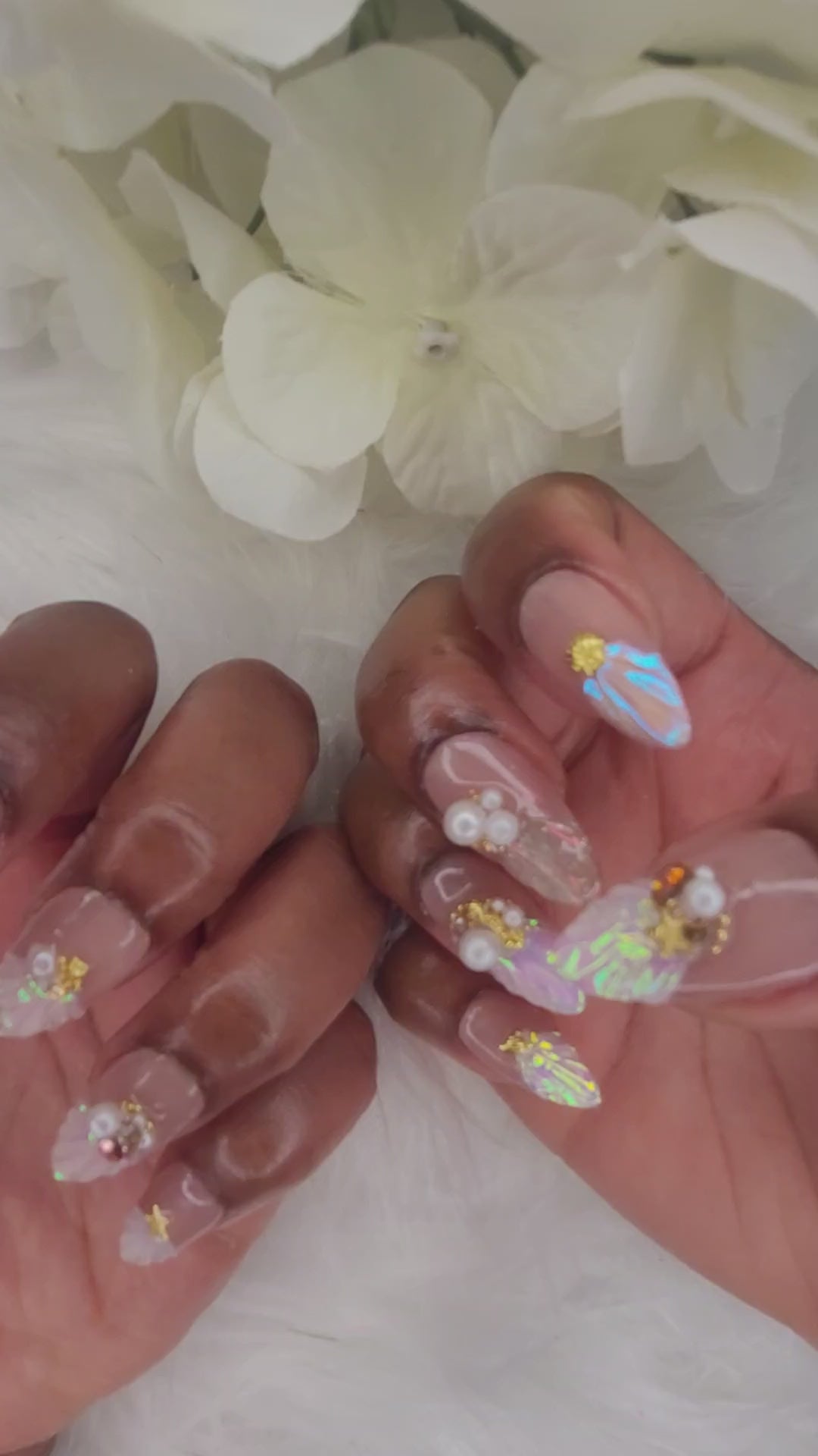 Make waves with our Seashell Radiance Press-On Nails, a dazzling blend of ocean-inspired beauty and holographic sparkle. Featuring a nude base adorned with iridescent seashell textures, pearl accents, golden charms, and crystal embellishments, this set captures the magic of the sea in every detail