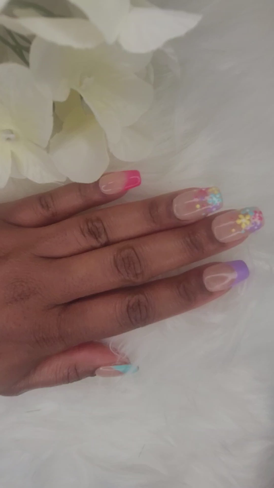 Step into spring with our cheerful Spring Fling press-on nail set – the perfect blend of playful colors and blooming floral charm. Featuring pastel French tips in blue, purple, and pink, plus two nails bursting with hand-painted daisy designs, this set is all about fun, freshness, and effortless style.